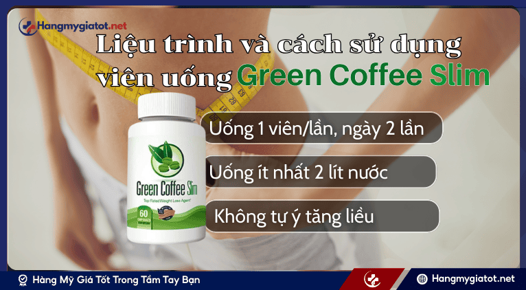 - Liều dùng Green Coffee Slim: Uống 1 viên/lần, ngày 2 lần, sau bữa sáng và bữa trưa (khoảng 30 phút sau ăn). Hãy uống cùng một cốc nước lọc đầy để cơ thể hấp thụ tốt hơn.
